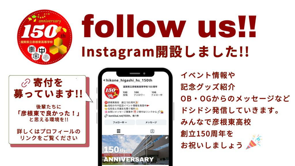 Instagramを開設いたしました。150周年に関する話題や企画を通して、卒業生の皆さんと母校をつなぐさまざまな情報を発信していきます。懐かしの先生、懐かしの校舎、現在の母校の様子、150周年記念グッズ、卒業生×在校生の交流イベントなど…。是非フォローください。同級生やお知り合いにも紹介いただけますと幸いです。みなさんで150周年を盛り上げていきましょう。